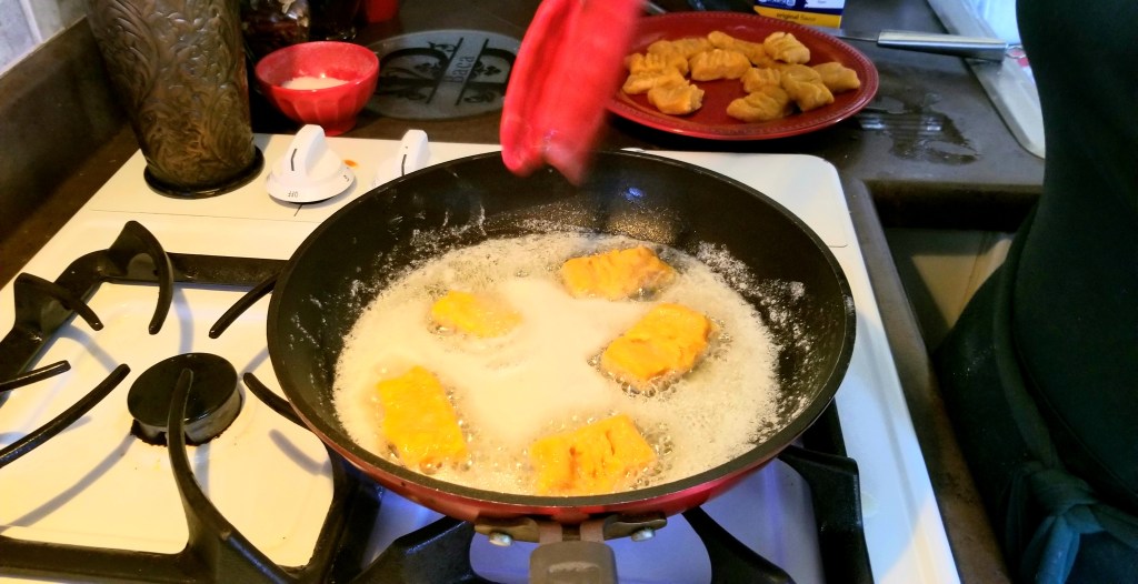 Melt the butter and oil in a large skillet until it starts to sizzle. Fry 6-7 cooked gnocchi until they brown nicely on either side, and again, repeat until all the gnocchi are fried.