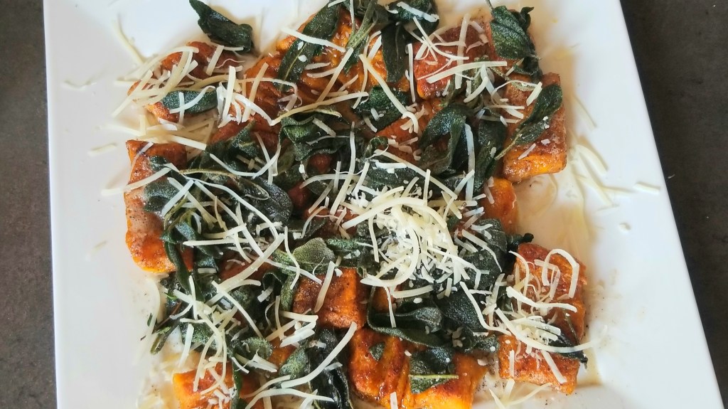 Gnocchi, if you don’t already know this, are little dumplings seasoned with salt. Simple to make, and this method adds the flavorful twist of pumpkin, sage, butter, garlic, and ricotta cheese to create these little bundles of deliciousness.