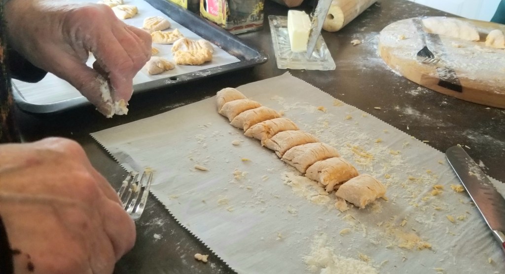 Cut 1-inch dumplings from each dough rope, and using a fork, press the tines into each dumpling to give it the classic shape. The tine marks also help sauce adhere to the gnocchi dumpling. I was fortunate to have help today in the form of my friend Tina and her grandson Michael, who helped with the kneading, rolling and fork-tining. It was great fun!