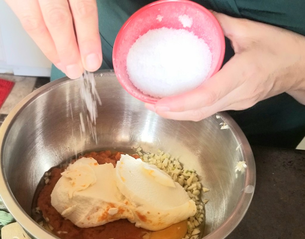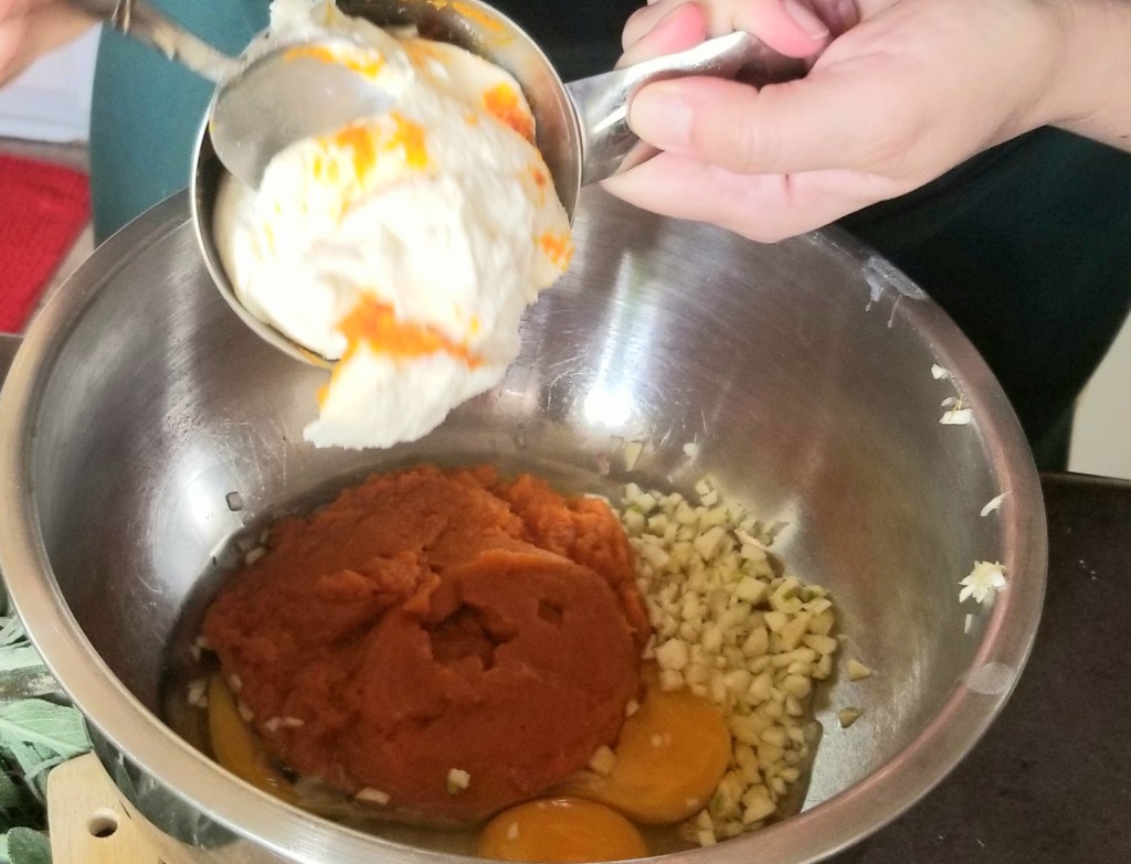 Combine the ricotta cheese, the pumpkin, the garlic, the eggs, the pepper and the salt in a large bowl and mix well to combine.