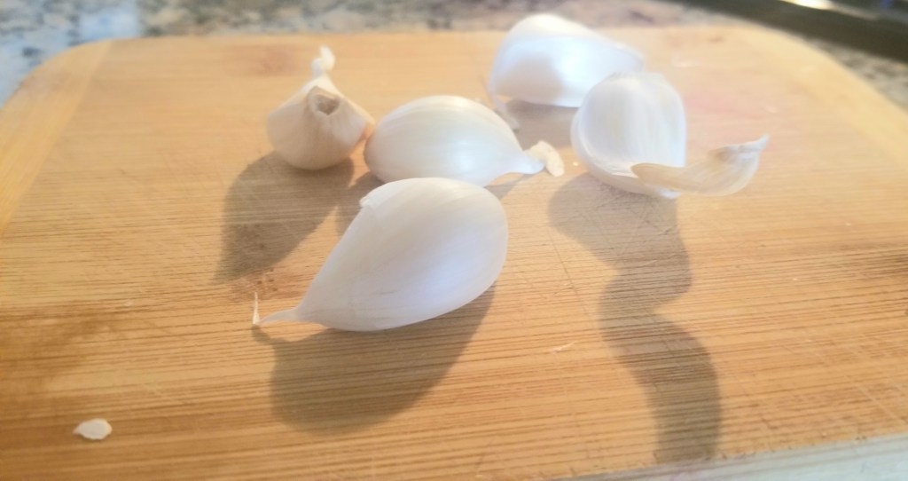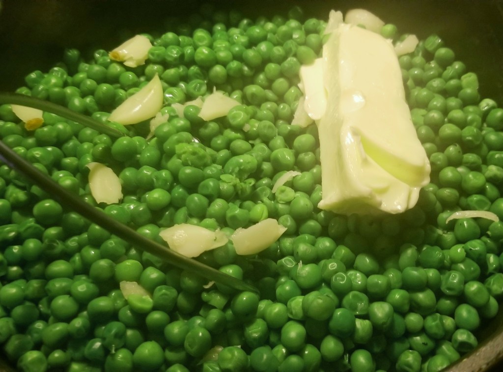 In the same pan, add the butter and toss in the peas and garlic cloves.