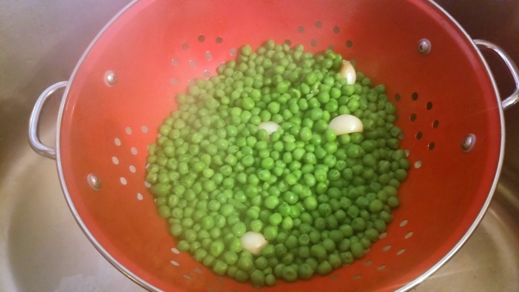 Heat a large saucepan of water and bring to a boil, and sprinkle in some salt. Cook the peas and the garlic cloves in the boiling water for about 5 minutes, then drain.