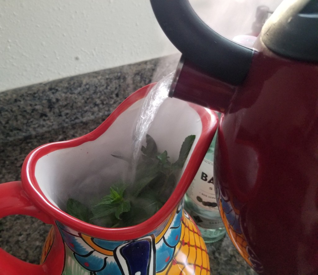 Brew your tea and let it steep with the most of the fresh mint leaves.