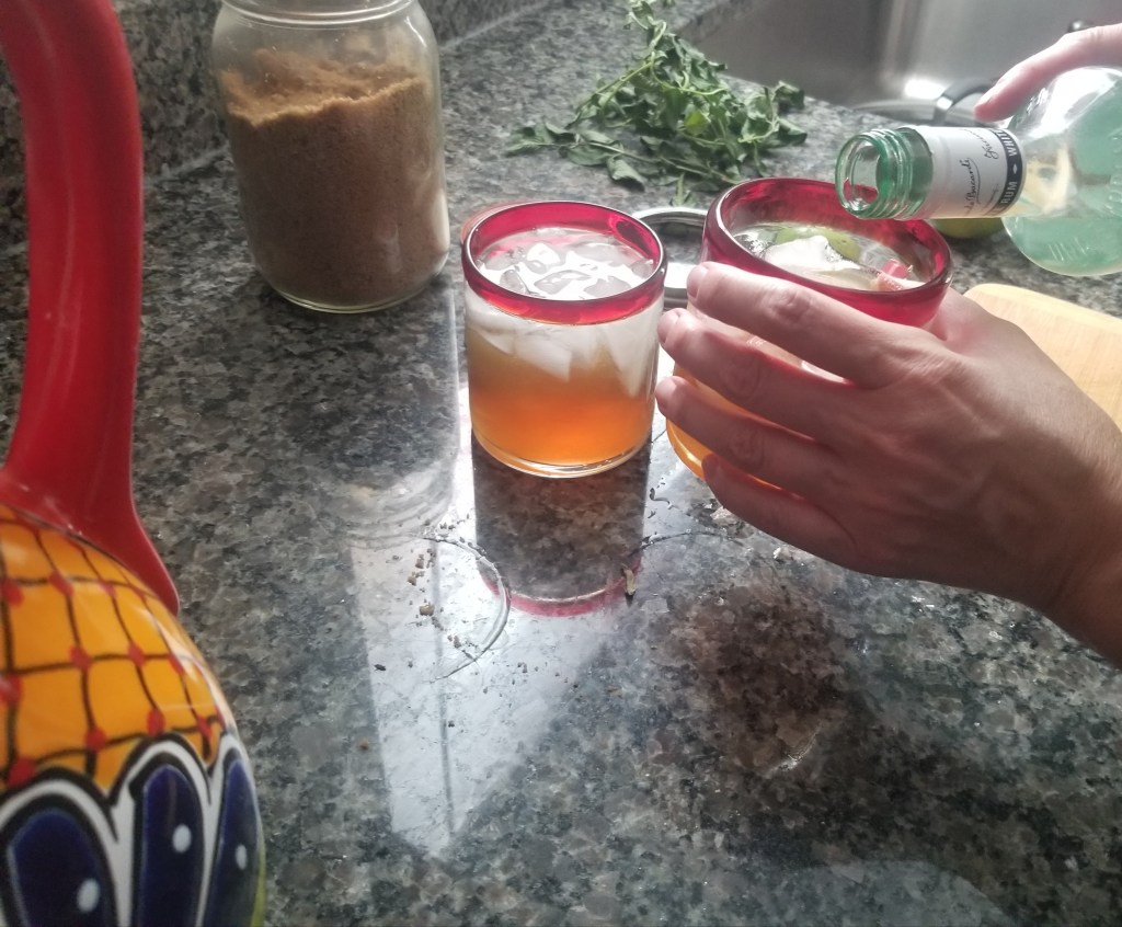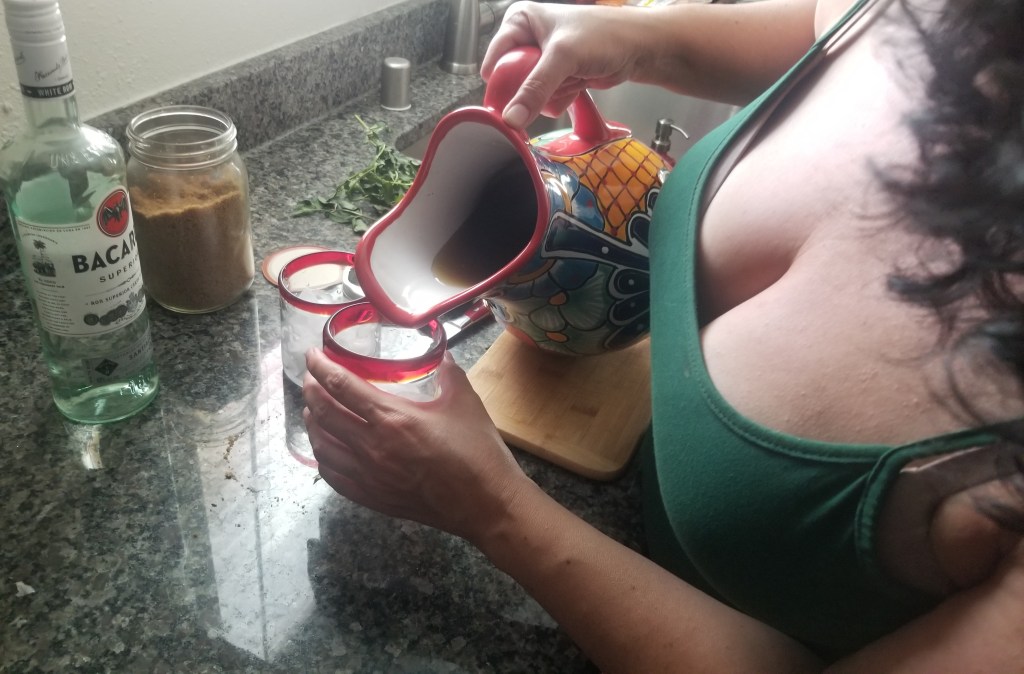 Once cool, pour about 8 ounces of the minty tea into an ice-filled rocks glass.