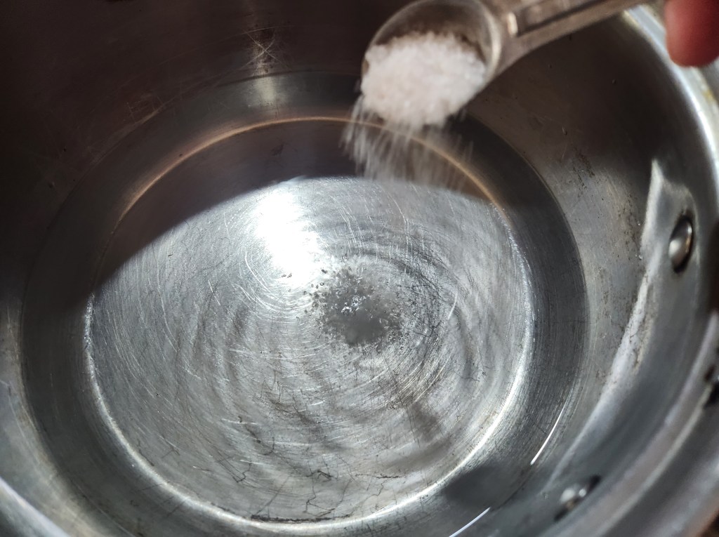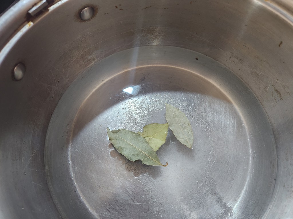 Add the bags of Parmesan rinds to the salted water and toss in the bay leaves.