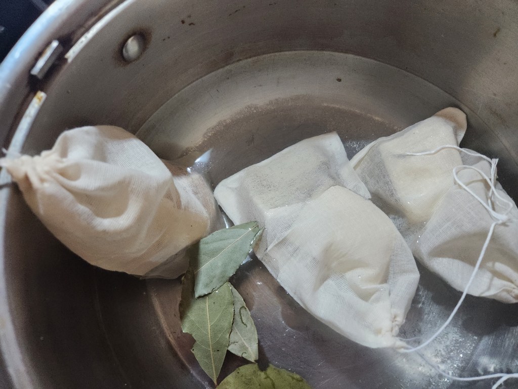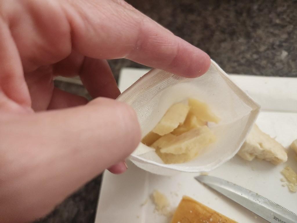 Take out your beautiful Parmesan rinds and admire them before scraping off any mold that has accumulated, then put them into cheesecloth bags. This is to avoid the rinds melting and sticking to the bottom of your pan and pushing you toward homicide when you have to scrub the pan for days on end.