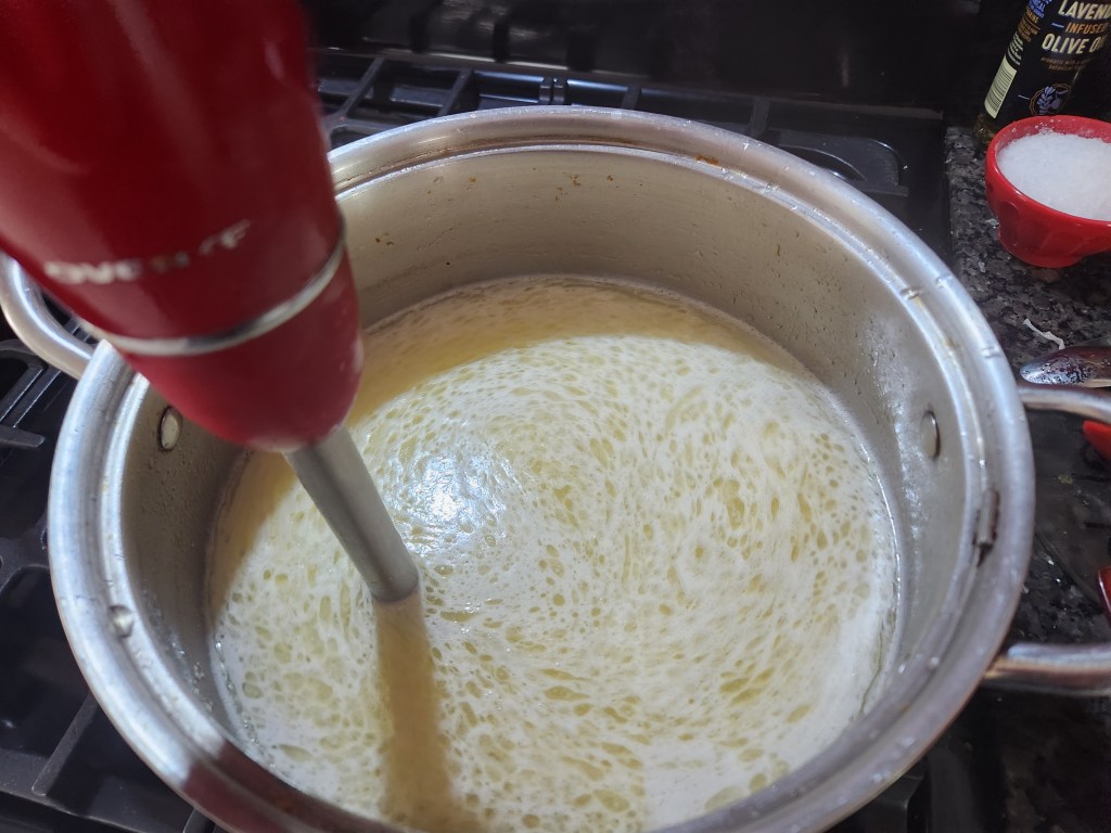 Remove the bags of cheese rinds from the stock along with the bay leaves. Add the rinds back into the stock and, using an immersion blender, blend the liquid with the rinds so that they break down and release even more flavor.