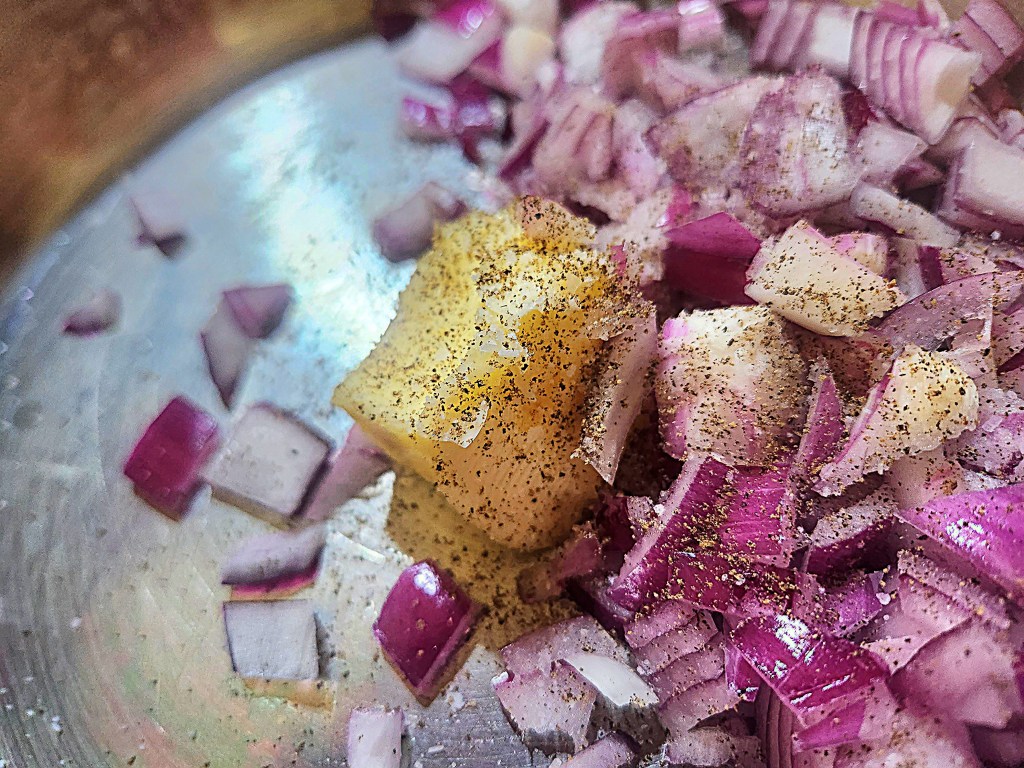 In a heavy skillet, melt butter and sauté the onion and garlic together for about 7-10 minutes. Season with salt and pepper.