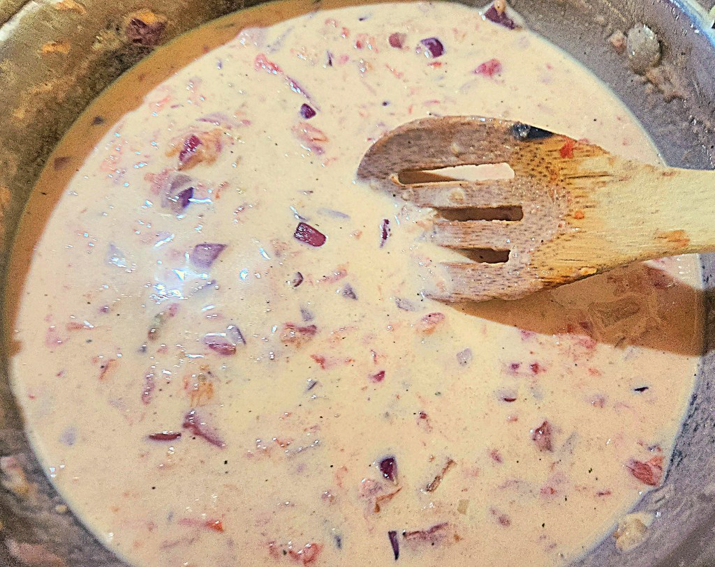 Slowly add the milk and bring to a simmer, then cover and cook on low for about 15 minutes or until it thickens into a gravy.