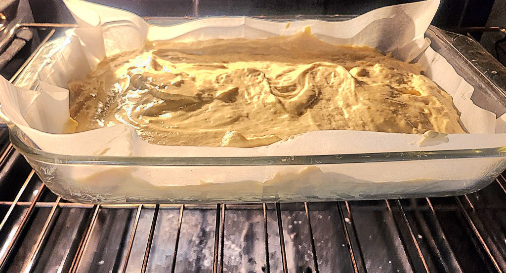 Pour the batter into the buttered and papered cake pan and bake for 25 minutes.