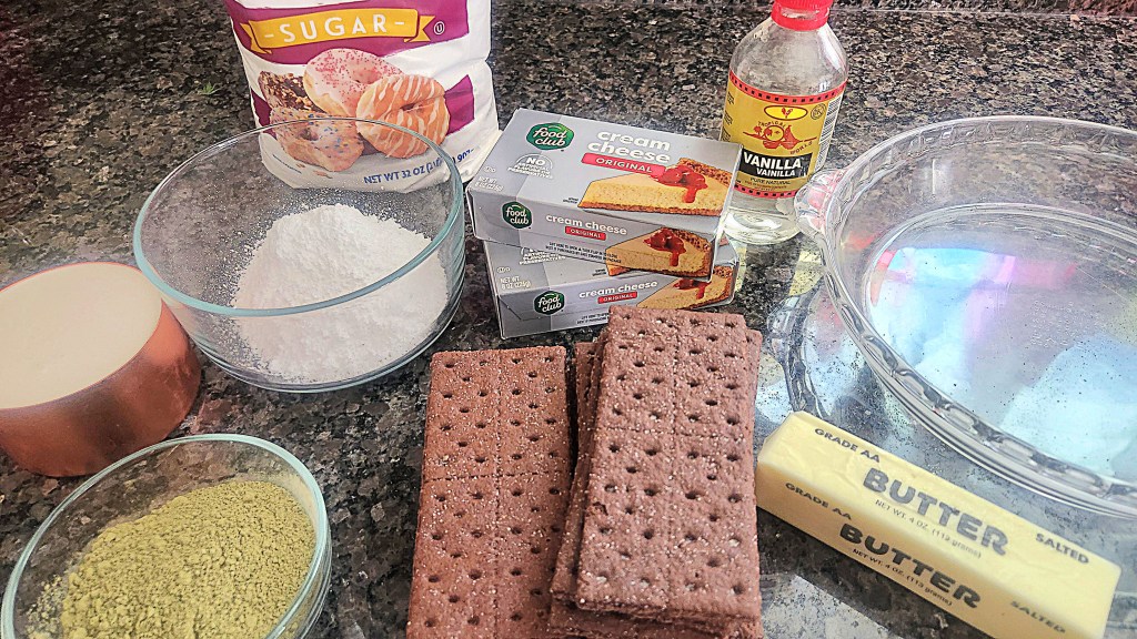One of the things I love about Moreno-Garcia’s work is how stunningly gorgeous her covers are. I thought Mexican Gothic, which I blogged about previously, had one of the most beautiful covers I’d ever seen, but The Bewitching might take the top prize. Look at the greens and golds! And of course, it perfectly matches the dish I made. Not that I planned it like that or anything. 🙂 Anyway, a matcha cheesecake was a totally new concept to me, but it sounded so delicious so I had to give it a go.