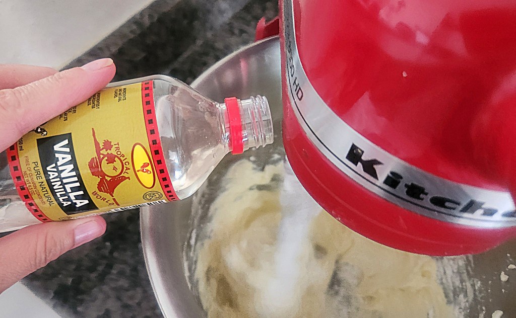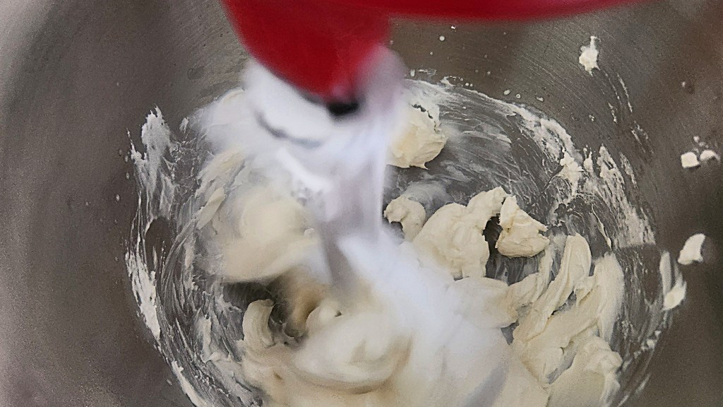 In the bowl of your most awesome red Kitchen Aid, beat together the cream cheese and the vanilla until the cheese is smooth and fluffy.