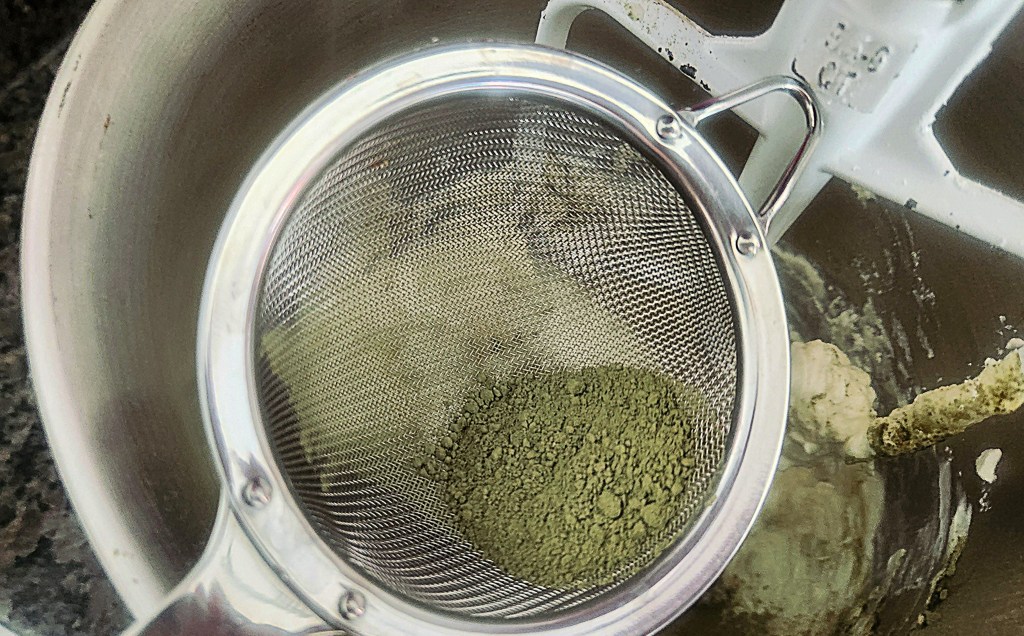 Using a sieve, add in the powdered sugar and then the matcha powder. You want to sieve these in to ensure they break down and mix smoothly.