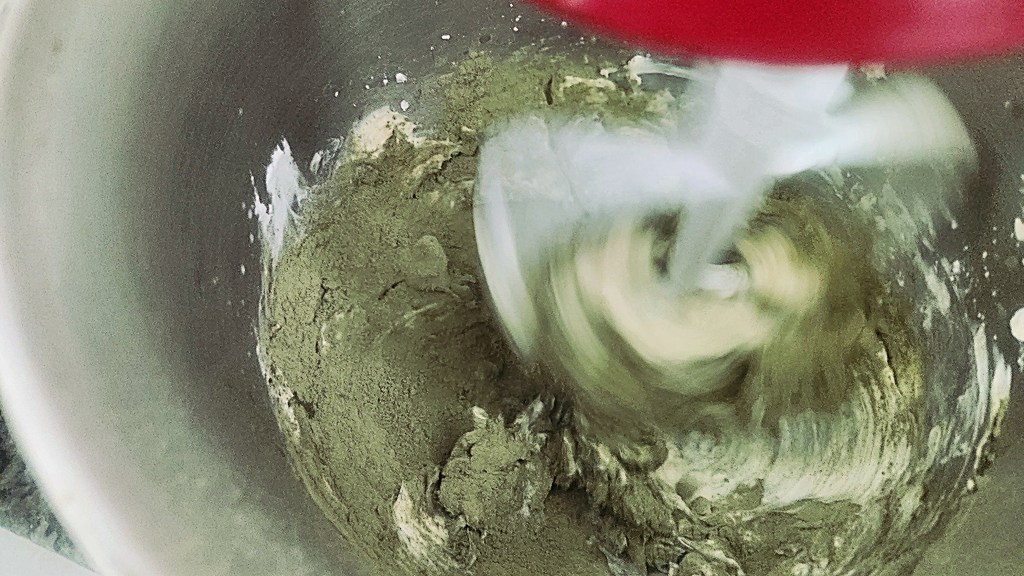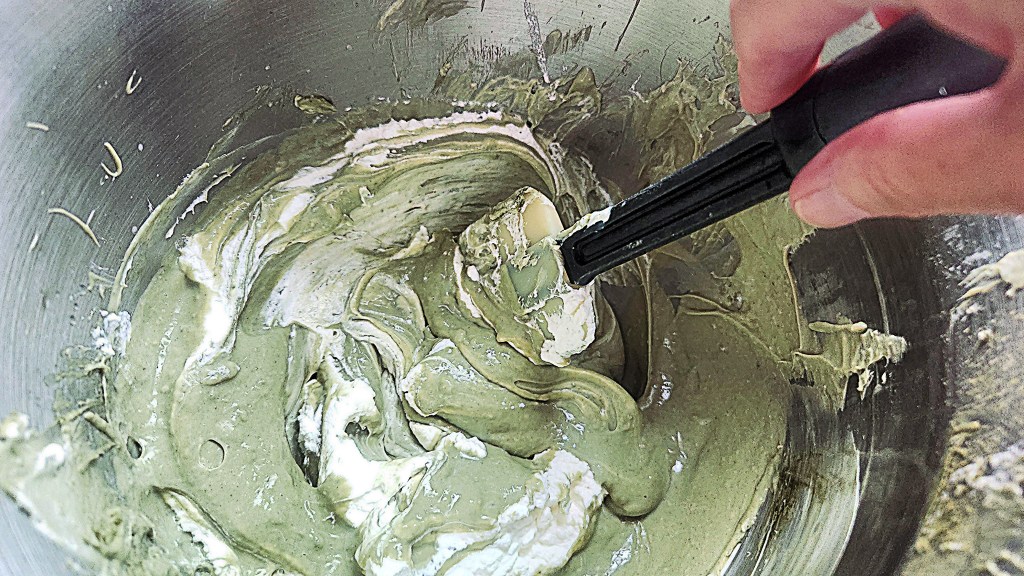 Whip the now-green mixture together for about 5 minutes, or until you get soft peaks.
