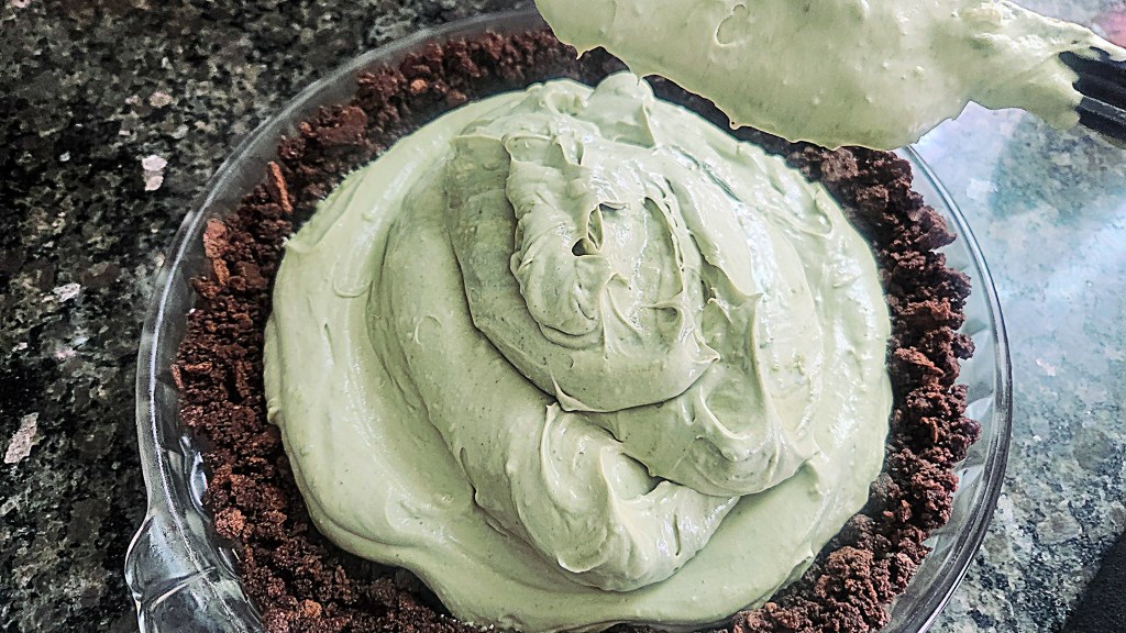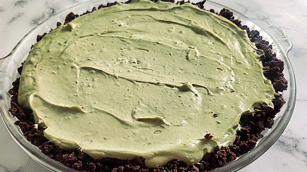 Spread the matcha-cream cheese filling over the chilled pie crust base, cover with plastic wrap, and refrigerate overnight.