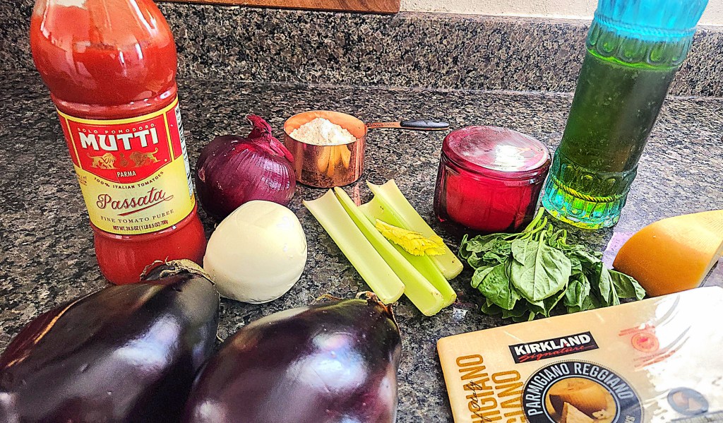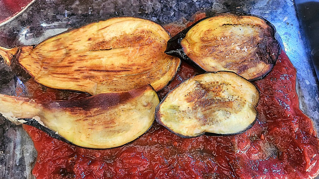 Well, that is clearly eggplant Parmigiana, which to me is one of my favorite Italian dishes to eat. I love eggplant, I love Parmigiano Reggiano cheese, and I love a good tomato sauce, and this dish combines all three. So I decided to return to my dad’s recipe, which is one of the things I remember him cooking from my childhood. It seemed strange then because we kids weren’t used to it, but that first taste of the eggplant with the lusciously melted mozzarella layer and the tomato sauce topped with salty Parmigiano Reggiano cheese was marvelous and one of my earliest food memories. So I decided to recreate it in homage to this book and in honor of Evelyn Dolman, the biggest dolt of all.