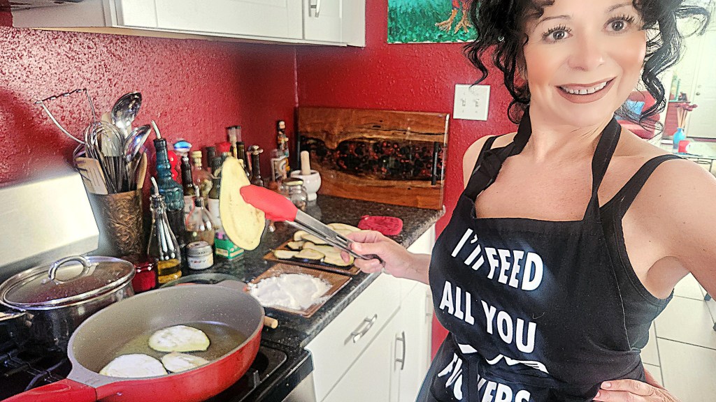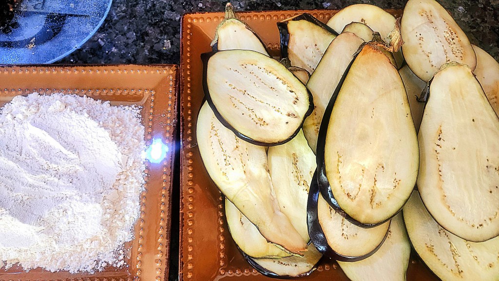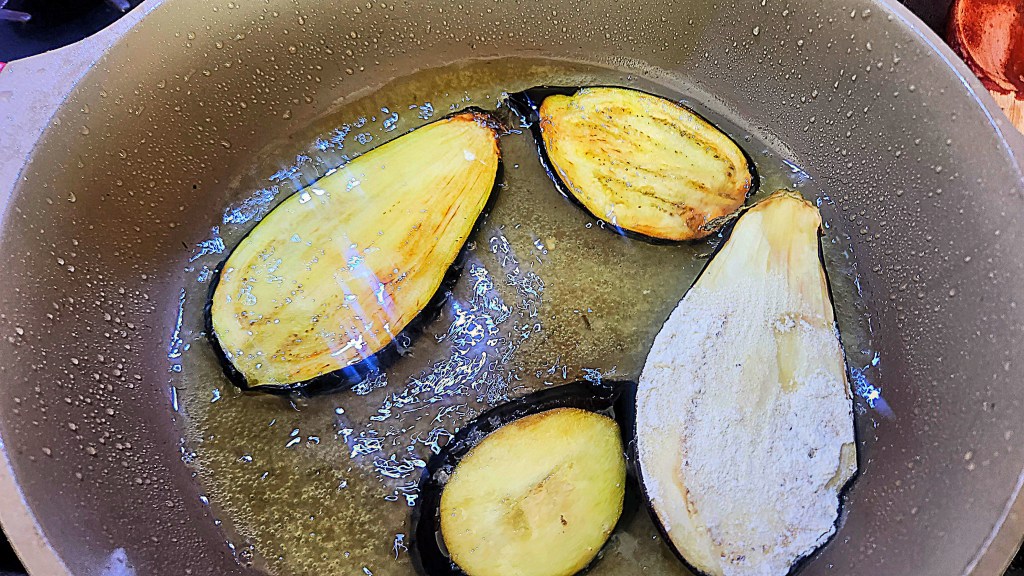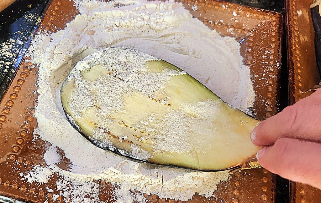 When ready to assemble, heat the oven to 385F, then heat the grapeseed oil in a large skillet and while it comes to the right frying temperature, lightly dredge each drained slice of eggplant in flour.