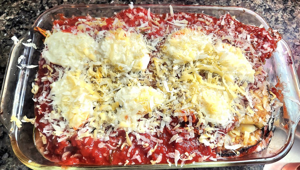 Continue until you’ve used all the eggplant slices, then pour over the rest of the tomato sauce and top with the remaining mozzarella slices and finish it off with a very generous sprinkling of shredded Parmigiano Reggiano.