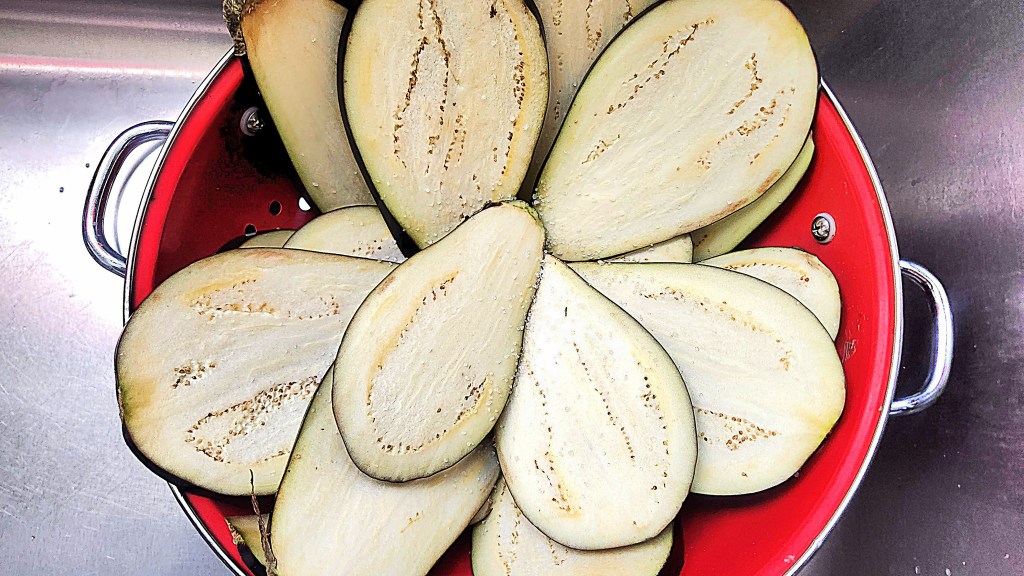 Lay the slices in a colander and sprinkle generously with salt. Leave to drain for about an hour, then pat dry and set aside.