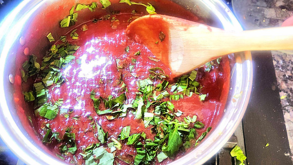 Pour the tomato passata over the onion and celery mixture, add the chopped basil, and stir to combine. Taste for seasoning and adjust as needed, then let the tomato sauce simmer gently for about an hour.