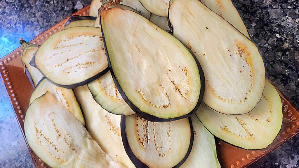 Slice the eggplants into lengthwise slices.