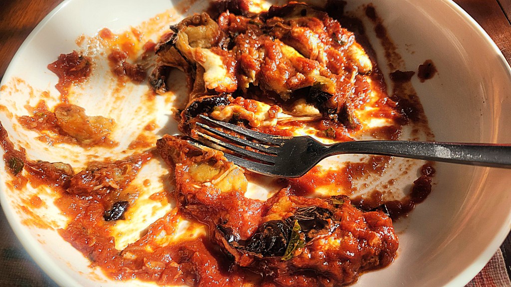 “In the end I gave up and ordered a dish at random, jabbing a finger at it on the card. It turned out to be a slice of aubergine, resembling a thick boot-sole, hidden under a shiny layer of grilled cheese that might be the boot’s leather tongue.”
