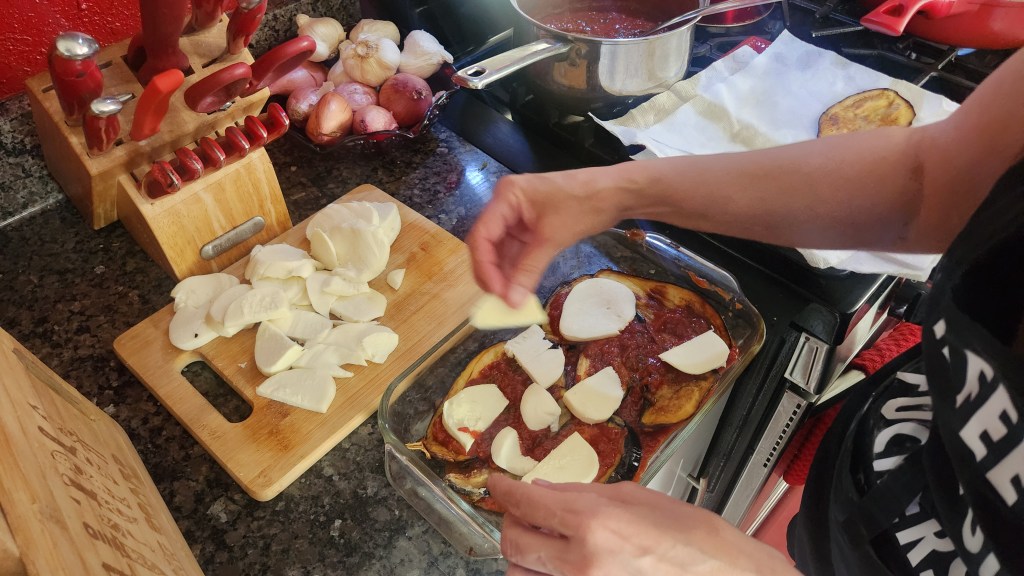 Add a layer of tomato sauce to the bottom of a glass pan, then add a layer of fried eggplant slices, then a layer of mozzarella.